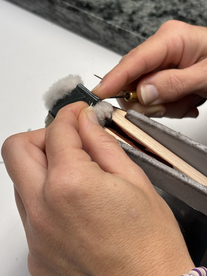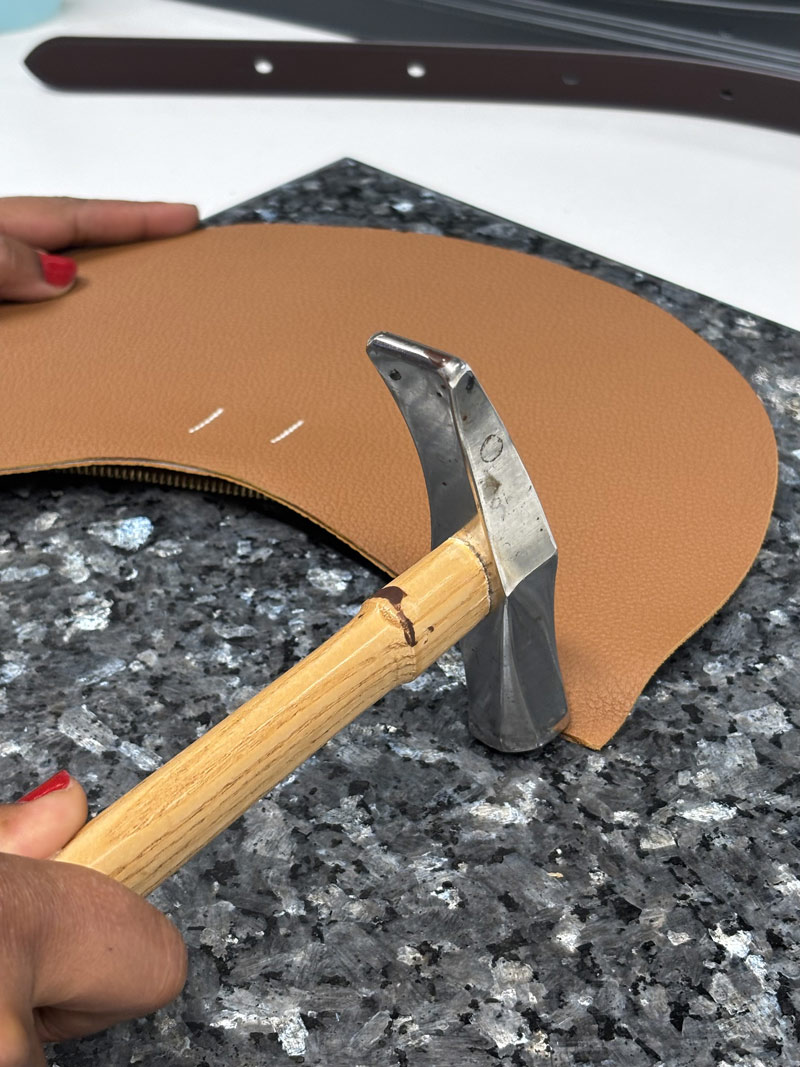 C’est lors de l’assemblage que les pièces prennent forme pour devenir sacs, ceintures ou accessoires. Couture à la main ou à la machine, pose de finitions, teinture des tranches… chaque geste est maîtrisé pour créer un objet à la fois fonctionnel, élégant et durable.